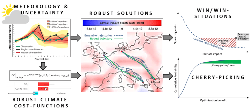 It is therefore of high importance to reduce climate impact as much as possible and at the same time consider airlines’ monetary interest by identifying eco-efficient trajectories which significantly reduce climate impact at no (“win-win”) or low (“cherry-picking”) cost penalties. Since both, the meteorological forecast and the climate impact estimates are subject to uncertainties, the identification of robust solutions is required e.g. by considering Ensemble Prediction System (EPS) weather forecasts. Building on latest knowledge of the former SESAR2020 Exploratory Research projects ATM4E and TBO-Met available within the consortium (Table 1.4), the project FlyATM4E addresses this challenge, aiming to identify robust trajectories which reduce climate impact.